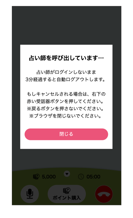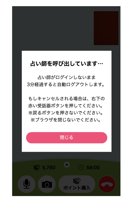 オンライン通話画面に切り替わり、占い師を呼び出します。占い師がログイン後鑑定スタート。