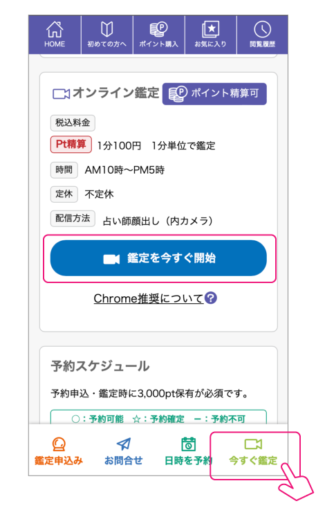オンライン鑑定待機中の占い師プロフィールページで「今すぐ鑑定」ボタンをクリックします。