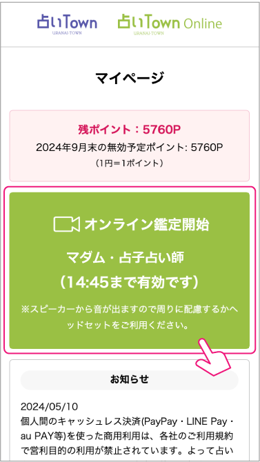時間になりましたらマイページの「オンライン鑑定開始」ボタンをクリックしてください。