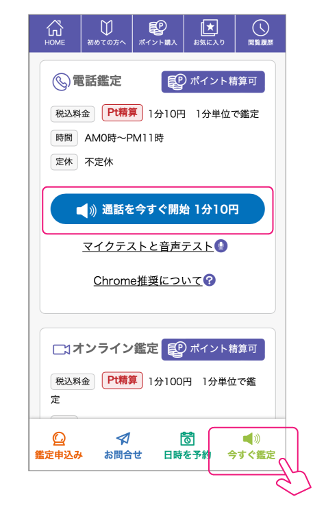 オンライン通話待機中の占い師プロフィールページで「今すぐ鑑定」ボタンをクリックします。