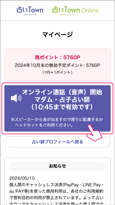 約束の時間になりましたら、マイページに「オンライン通話(音声)開始」ボタンが1時間だけ表示されていますので、打ち合わせたタイミングで「オンライン通話(音声)開始」ボタンをクリックしてください。占い師を呼び出します。