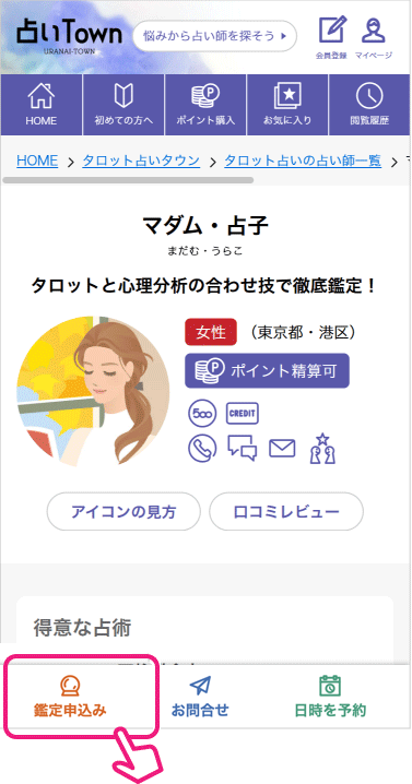 オンライン鑑定の待機をしていないときは、占い師プロフィールページの下部にある「鑑定申込み」をクリックします。