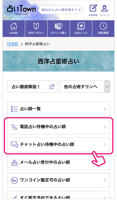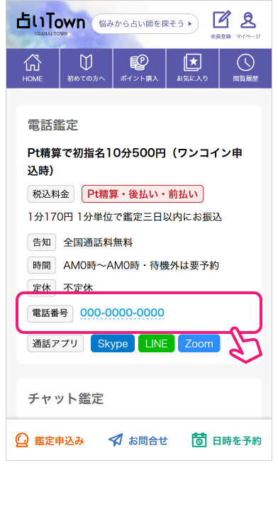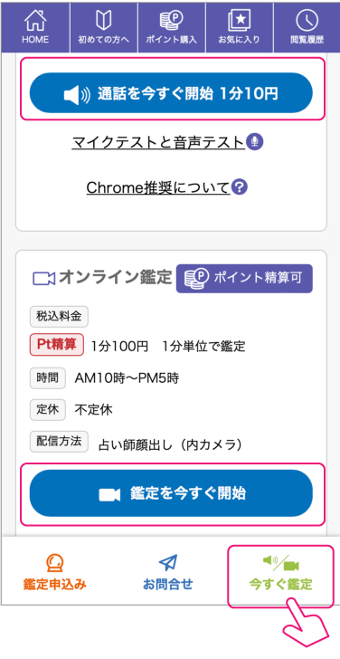電話かチャットで今すぐに鑑定してほしい場合は、以下の手順で行えます。