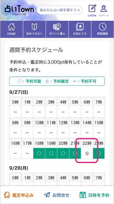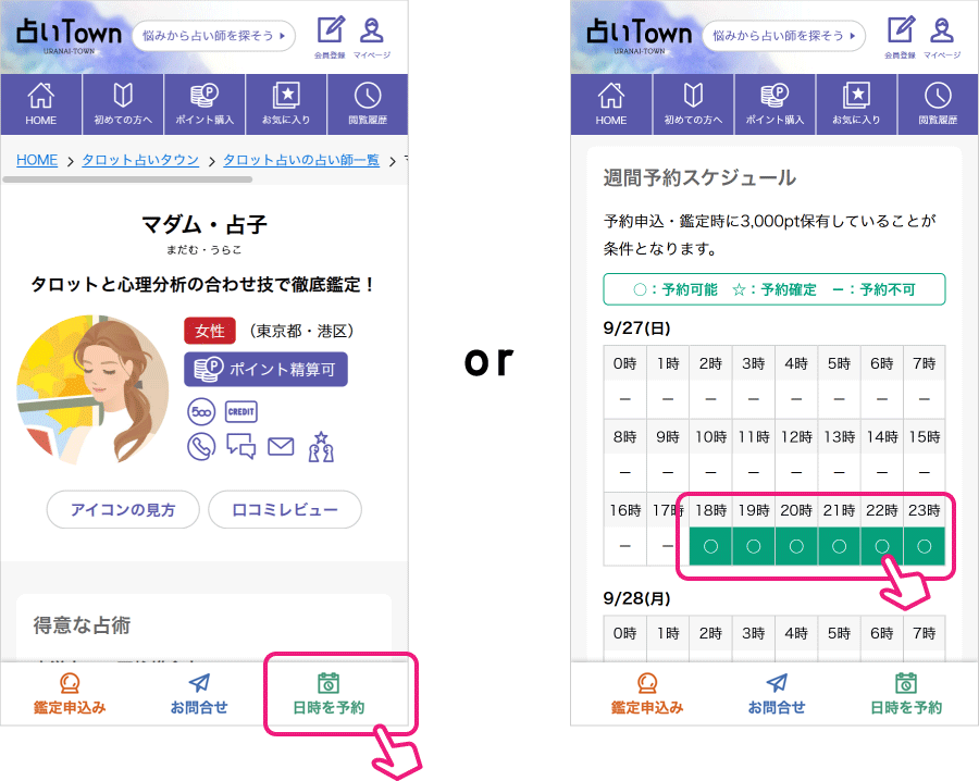 占い師プロフィールページの下部にある「日時を予約」をクリックするか、「週間予約スケジュール」欄の希望予約日時の「○」印をクリックします。