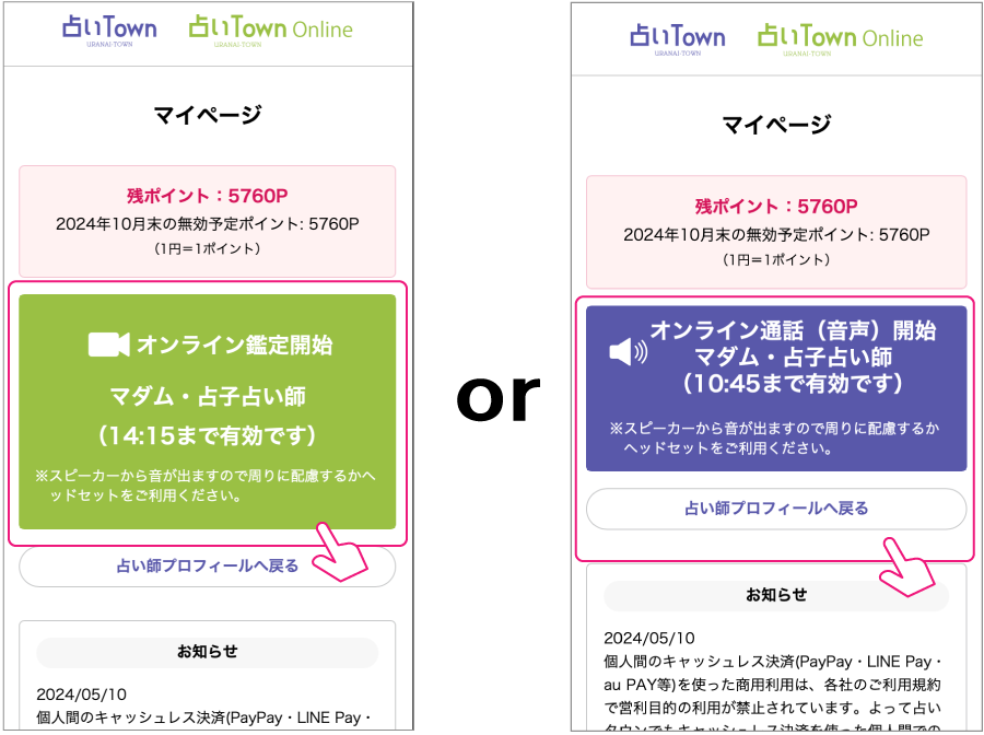 鑑定時間になりましたら、マイページにある「オンライン鑑定(映像)開始」ボタンまたは、「オンライン通話(音声)開始」ボタンをクリックしてください。